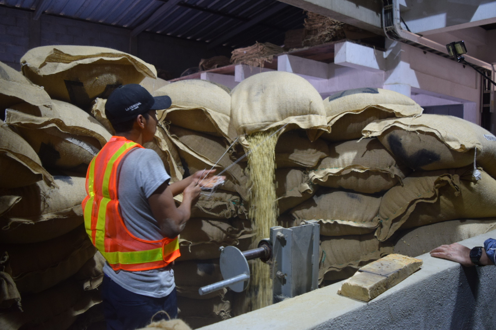 このドライミルでは、69kg入りの麻袋が1日に300袋、およそコンテナ1台分のコーヒー豆を精製できるという。目の前に積まれた麻袋の山は、すべてカリフォルニアを中心に展開しているVERVE COFFEEへと送られるそうだ。