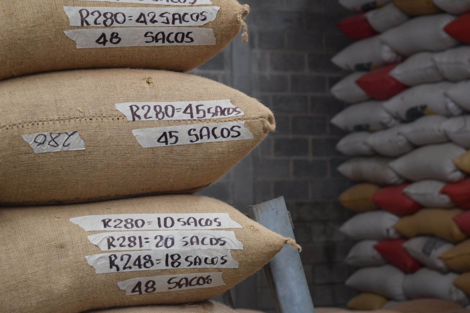 (ドライミルの中にはたくさんの麻袋が。生産者はナンバーによって分類される。SACOSは袋の数を表す)