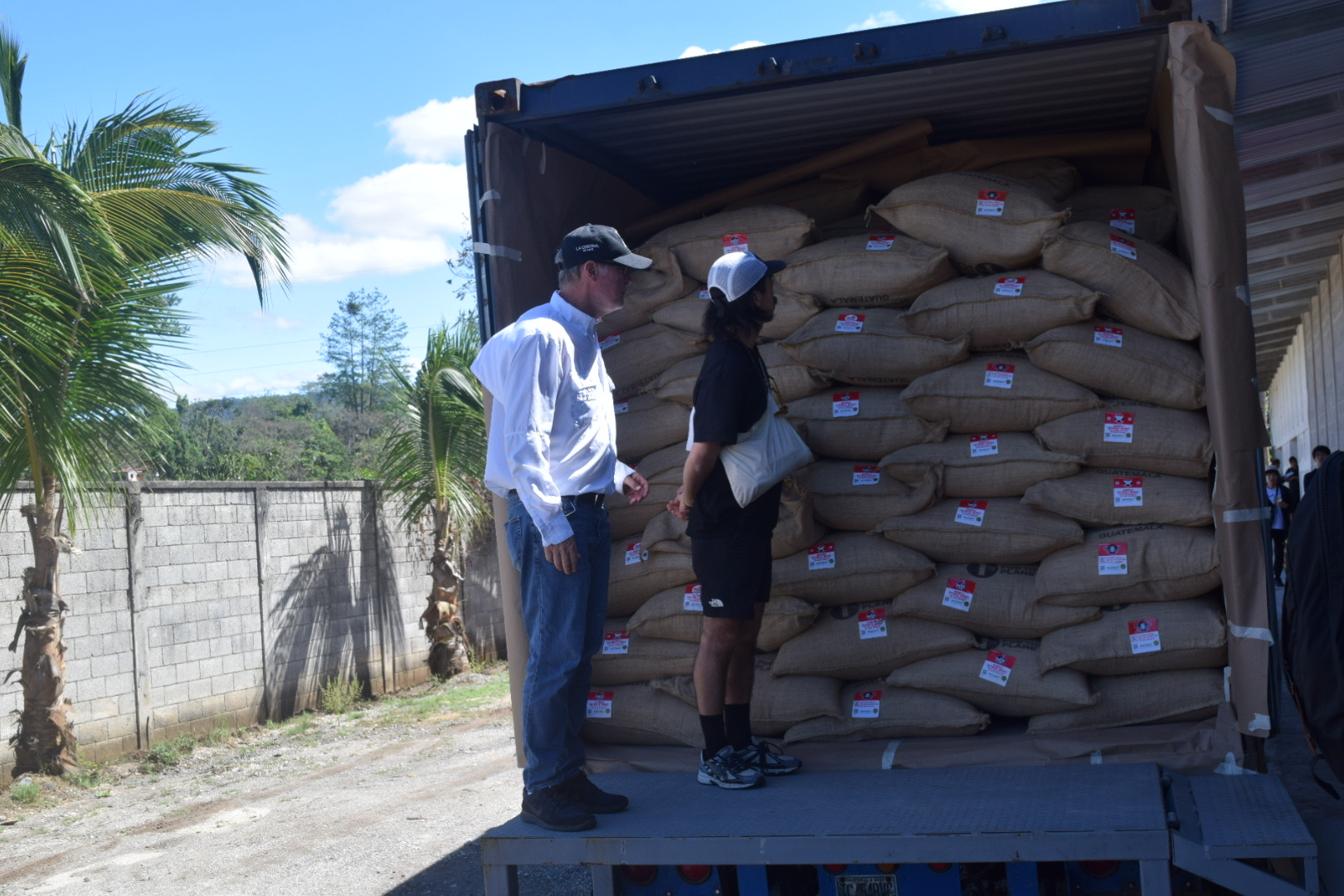 (このコンテナに積んであるコーヒーはすべてカリフォルニアのVERVE COFFEEに運ばれる。赤いシールが貼られている麻袋は中をチェックしなくてもいいという印)